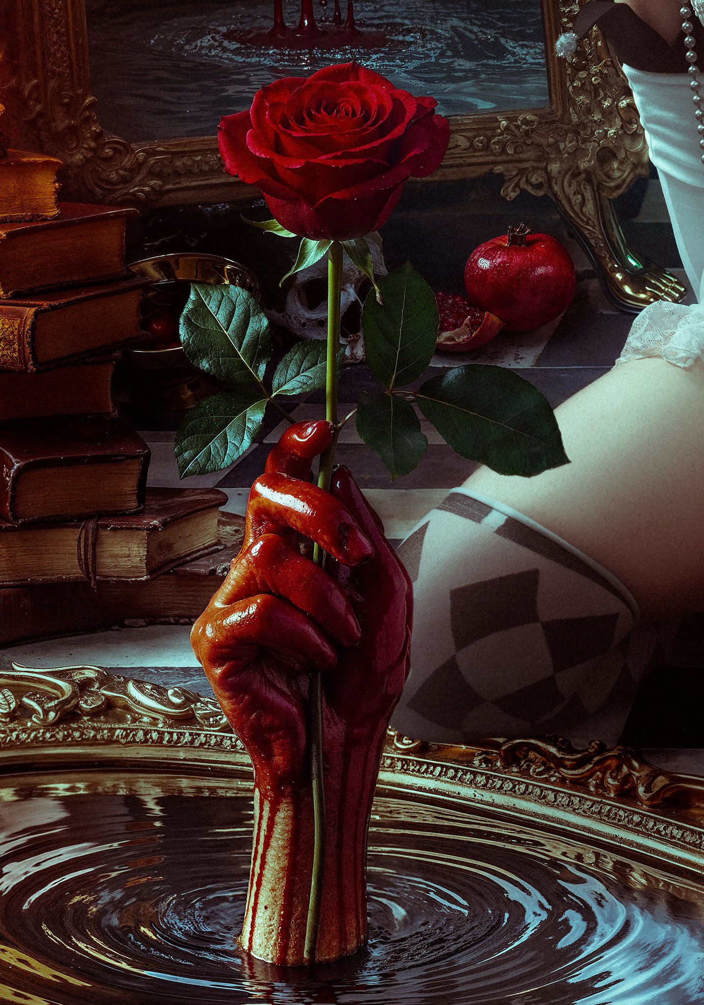 En el suelo, una Mano Ensangrentada emerge del agua (el inconsciente) para ofrecer una rosa roja: el símbolo máximo del amor y el dolor, de la belleza que nace del sacrificio.
