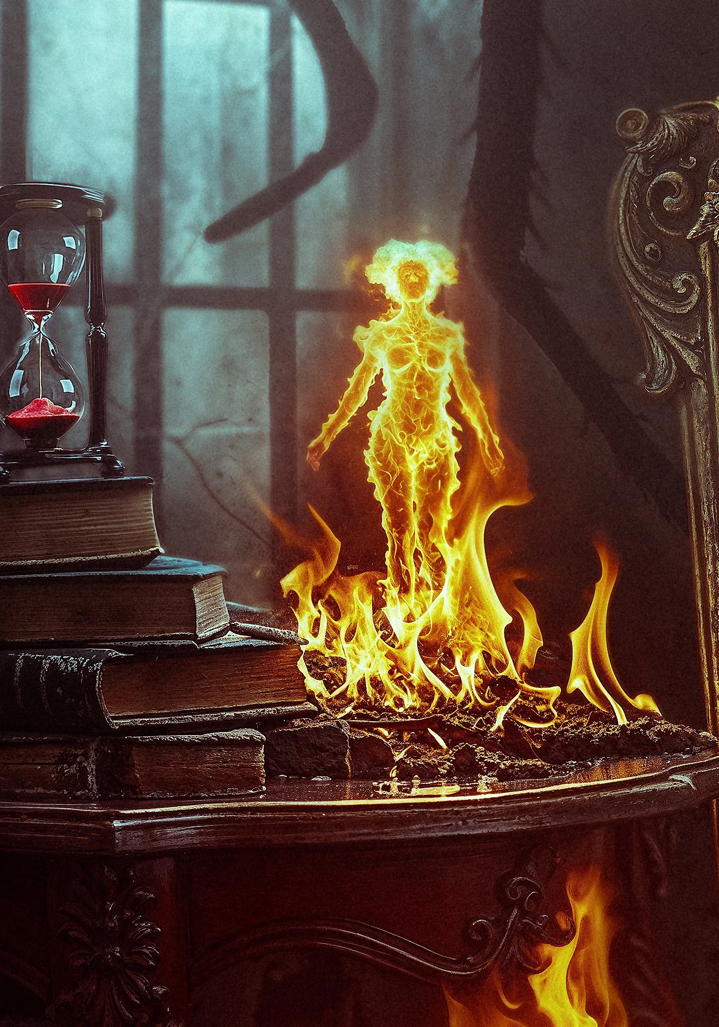 Sobre los libros, una Figura de Fuego ) arde junto a un reloj de arena. Es la purga, la transformación a través del dolor, la sensación de que el tiempo se acaba para sanar esa esencia ariana de mi propio Sol.