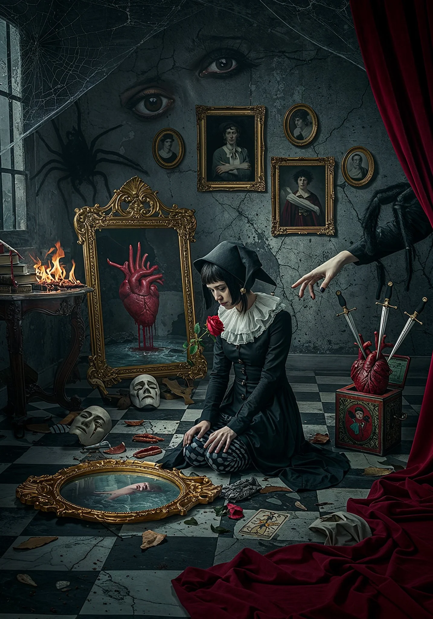 El Espejo Principal: Fijaos bien. No la refleja a ella. Refleja su estado interior: un corazón anatómico, latiendo, sangrando. Simboliza que su verdadera identidad ahora mismo es esa herida abierta.